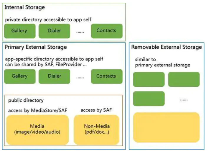 - APP 可以通过 SAF(System Access Framework)、MediaStore 接口访问其中的文件。