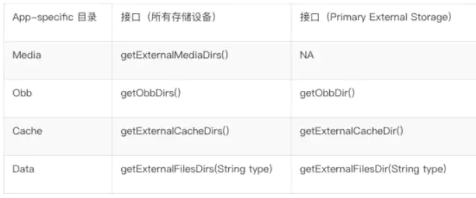 无需任何权限,APP 即可直接使用文件路径来读写自身 App-specific 目录下的文件。获取 App-specific 目录路径的接口如下表所示。