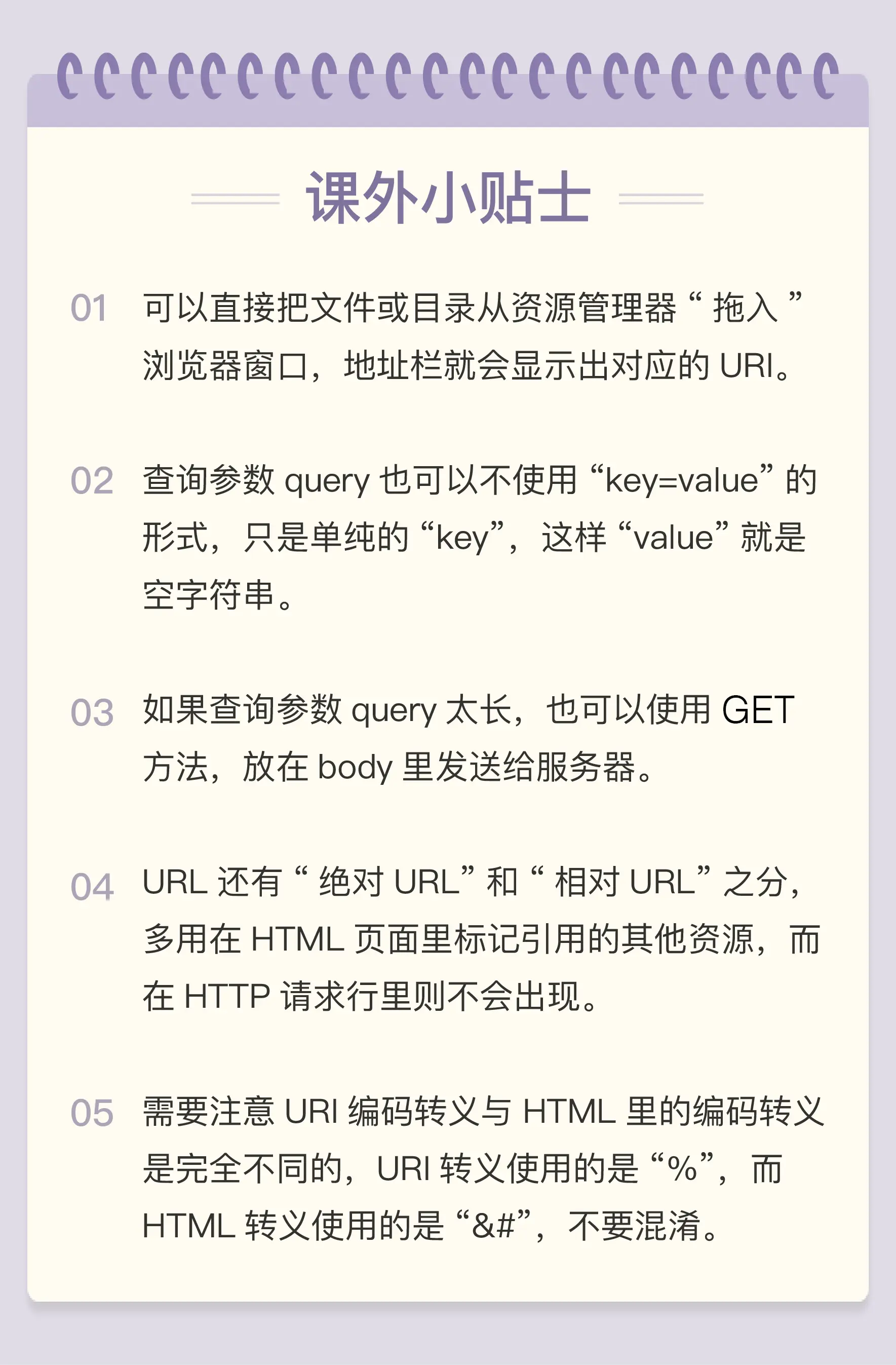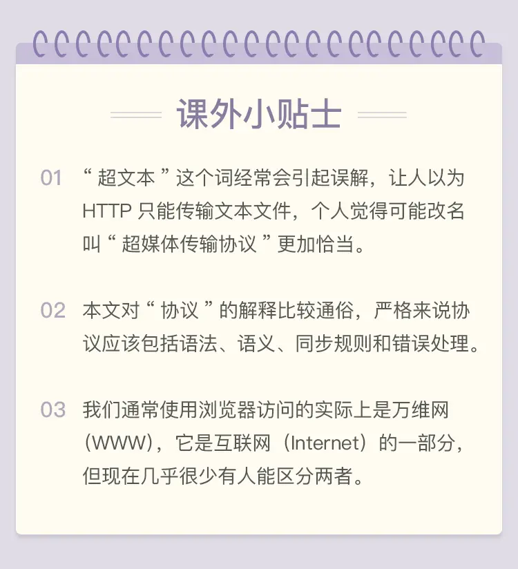 - HTML 是 HTTP 协议传输的主要内容之一,它描述了超文本页面,用各种“标签”定义文字、图片等资源和排版布局,最终由浏览器“渲染”出可视化页面。