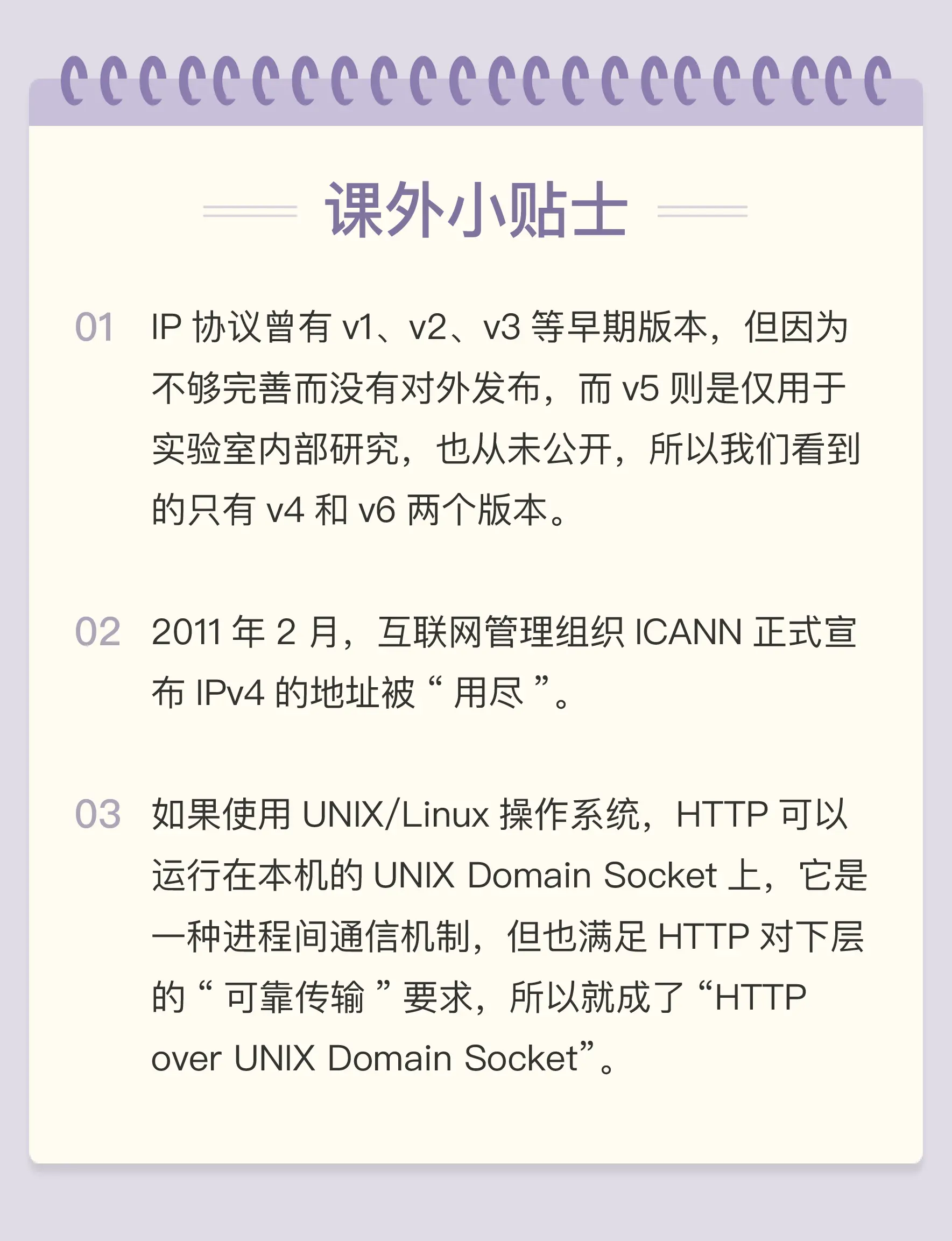 2. **网际层(internet layer)**:IP 协议就处在这一层。因为 IP 协议定义了“IP 地址”的概念,所以就可以在“链接层”的基础上,用 IP 地址取代 MAC 地址,把许许多多的局域网、广域网连接成一个虚拟的巨大网络,在这个网络里找设备时只要把 IP 地址再“翻译”成 MAC 地址就可以了。