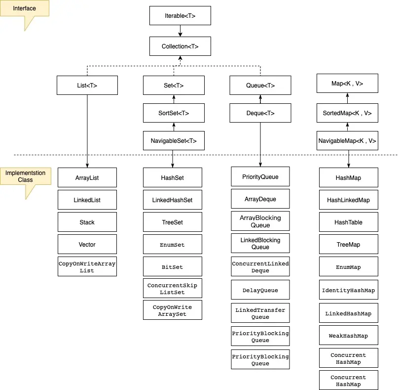 | Set | HashSet:存储元素不可重复,底层基于HashMap EnumSet:专门为Eunm设计的集合类 BitSet:Bit或密集的整数Set LinkedHashSet:保持Key插入顺序 TreeSet:有序集合 |