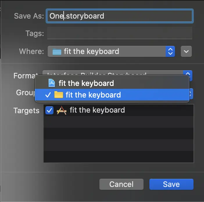 给‘子storyboard’取名,Group选择为黄色文件夹(忘选也没关系,待会拖到和main.storyboard同级即可),保存: