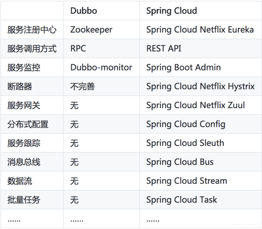 springcloud: springcloud是一整套的微服务解决方案,有一张很有名的对比图可以清晰看到dubbo和springcloud功能对比,如下:
