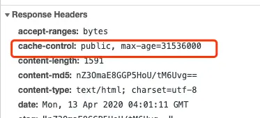 在浏览器的开发者工具中,查看当前页面html的响应头,可以看到cache-control: public, max-age=31536000;也就是该html 会被缓存31536000ms这么长的时间,之后才会请求新的 html 页面(当然强制刷新除外)。