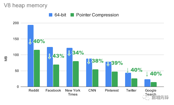 我们观察到指针压缩将 V8堆的大小减少了多达 43%!反过来,它可以将桌面版的 Chrome 渲染器进程内存减少多达 20%。