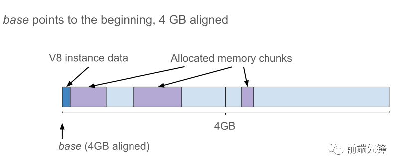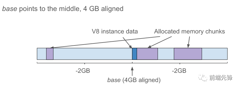 如果我们将 V8 的堆放在地址空间的连续 4 GB 区域中的其他位置,则从基址(base)开始的无符号 32 位偏移量将会唯一地标识指针。