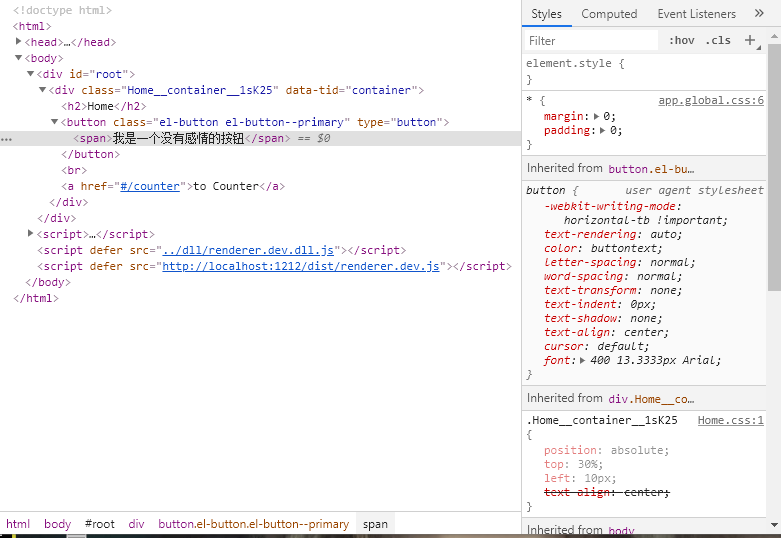 发现其他生效的class和button的class有点区别,生效的class被加上了前缀和后缀,这应该是webpack中编译css,把文件中的类名等选择器加上了前缀和后缀