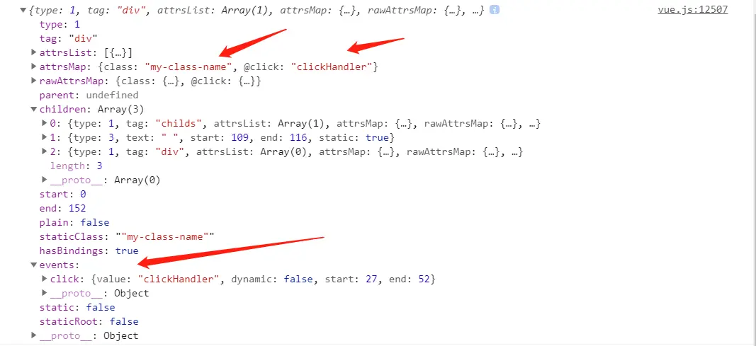 上面是一个Vue实例引用一个组件,并且给组件监听了事件,还给外壳的DIV标签添加普通的DOM事件,那么我们看看各个阶段的处理以及处理的结果