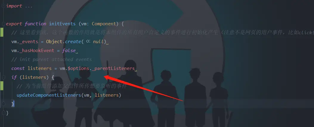 在listeners属性中,我们翻看源码,在core/instance/events.js中出现,也就是在组件初始化的时候会进行处理。