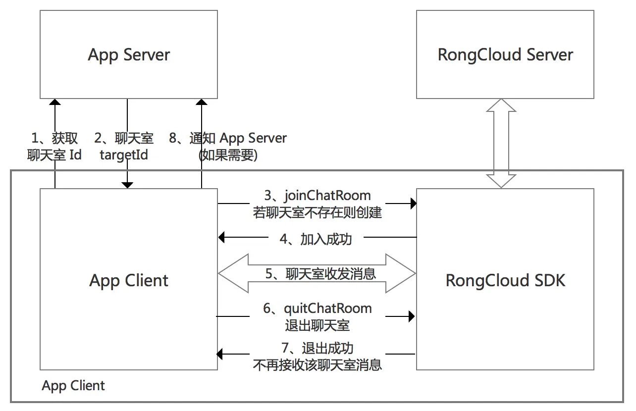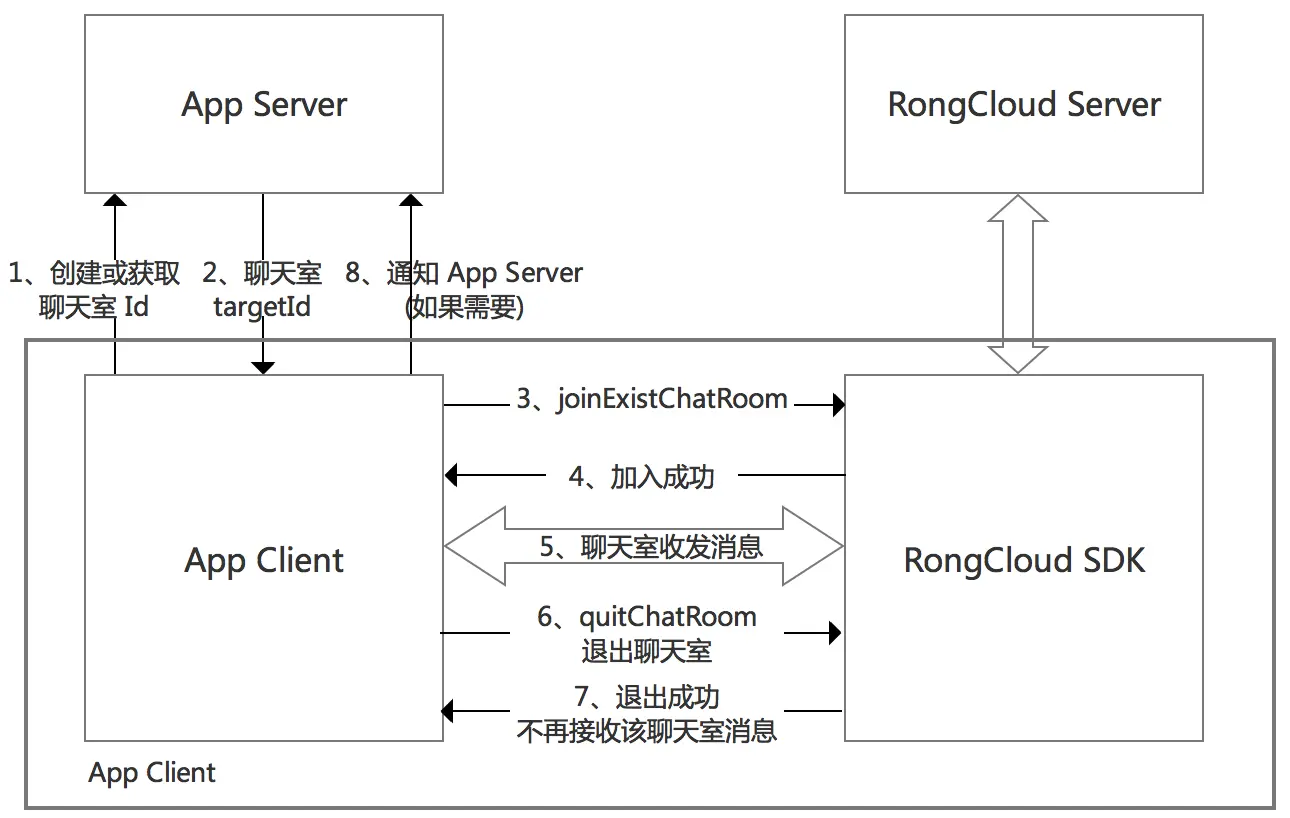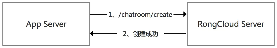 1.App Server 创建聊天室,客户端调用 joinExistChatRoom 加入聊天室,如果聊天室不存在,则加入不成功,需要 App Server 先调用 RongCloud Server 创建聊天室,如图: