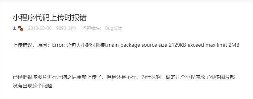 uni-app 源码包超出最大限制,source size 2054KB exceed max limit 2MB 云的旋律 2020-04-14 9,818 阅读1分钟 方案一: 资源文件尽量放到云端,不要放到本地小程序文件夹中,尤其是大的图片。(代码和图片资源2M大小限制,官方要求) 方案二: 采用分包加载,最大不能大于8M(代码资源总容量8M以内)