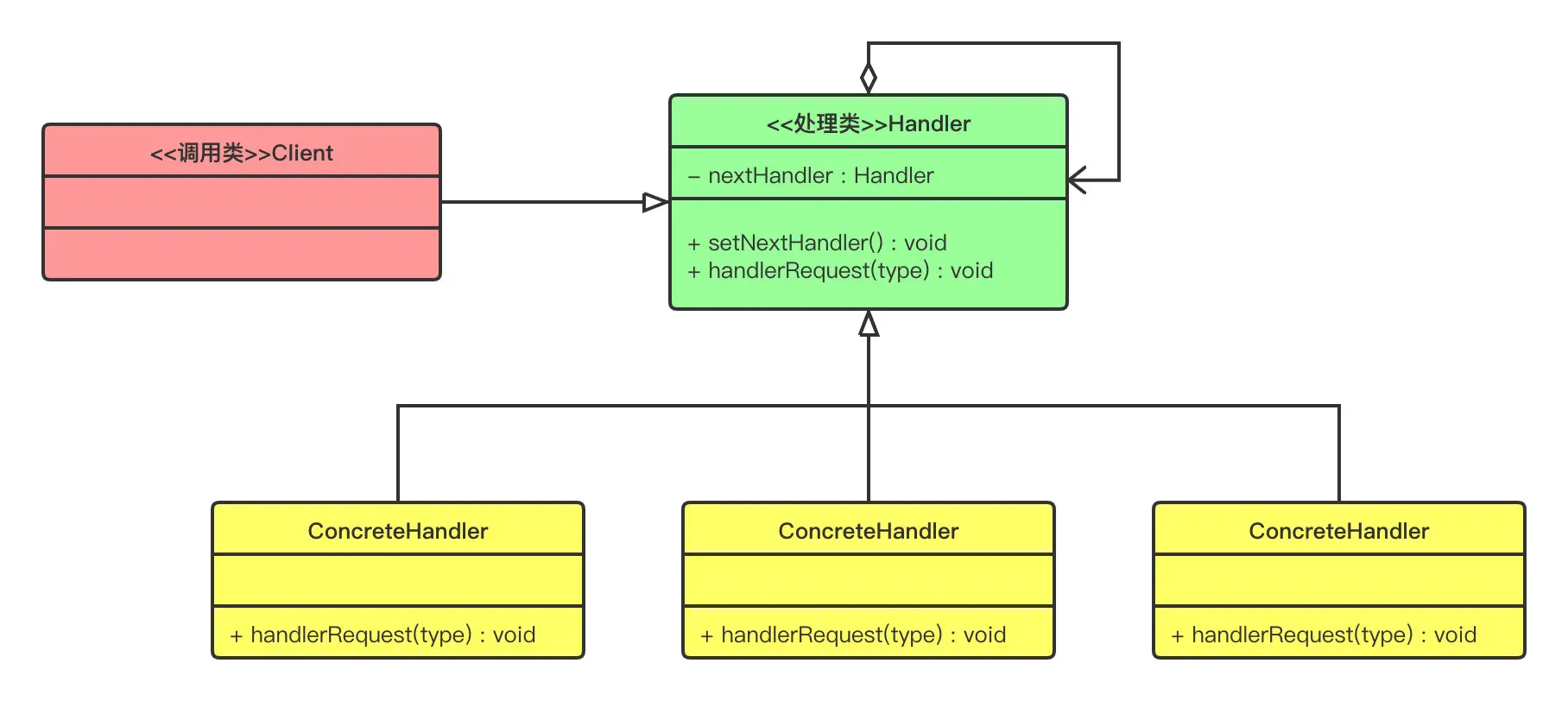 - ConcreteHandler: 具体处理类主要是对具体的处理逻辑和处理的适用条件进行实现。具体处理者接到请求后,可以选择将请求处理掉,或者将请求传给下家。由于具体处理者持有对下家的引用,因此,如果需要,具体处理者可以访问下家