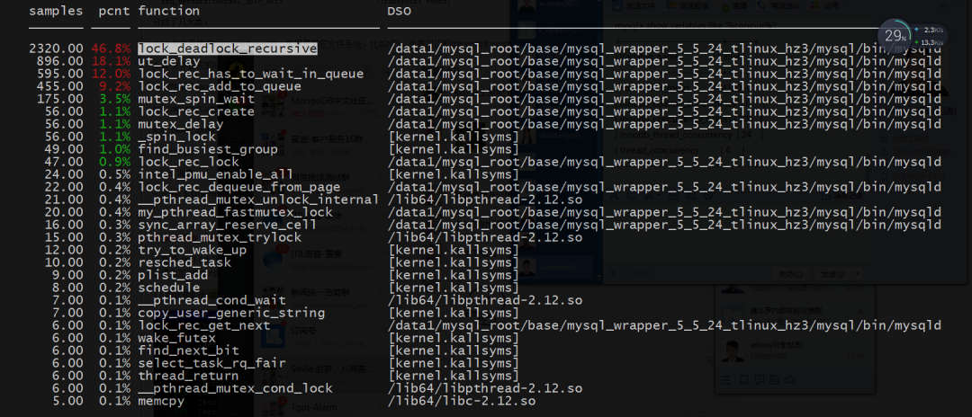 通过pref分析,显示lock_deadlock_recursive函数占据了cpu recycle事件的近50%时间。该函数是通过深度优先算法进行递归调用,检测是否满足死锁条件,再进行最小代价的事务回滚。