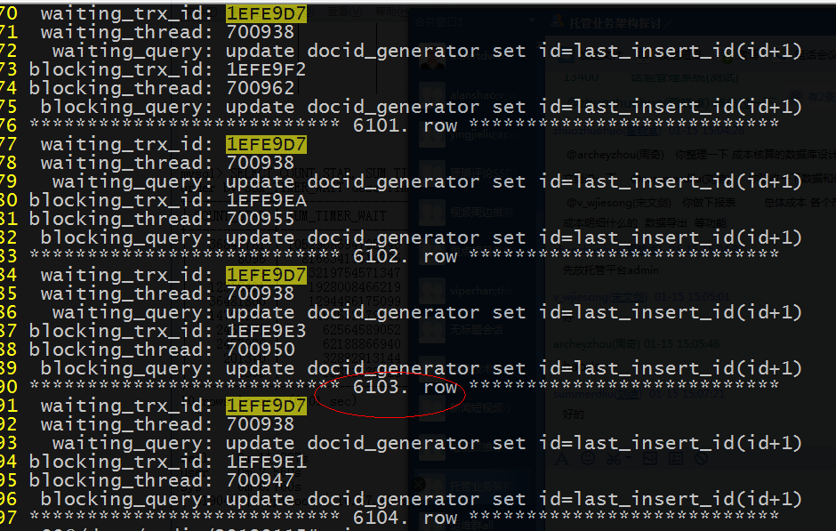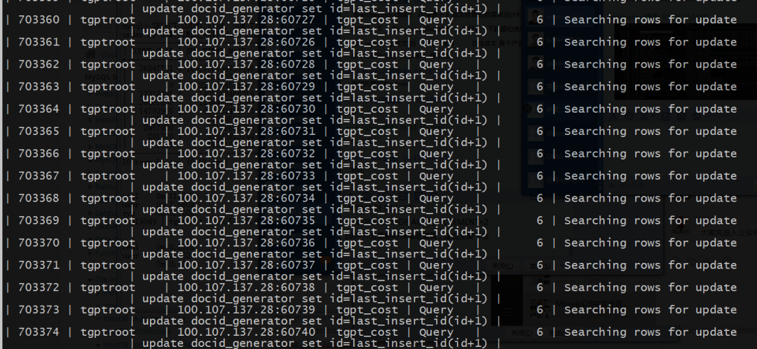 connectupdate docid_generator set id=last_insert_id(id+1); select 1645468 exit通过初步排查,了解到:表中只有一个字段、一行记录,该段业务逻辑是通过mysql中last_insert_id(expr)函数特性实现id分配功能;按照processlist执行耗时倒序查看,耗时最长的sql也是该类update请求;innodb status可以看到大量的事务在等待该条记录的X锁;update的X锁使得请求只能串行进行,导致响应很慢,可是最先到来的一批update请求是什么原因卡住了呢?