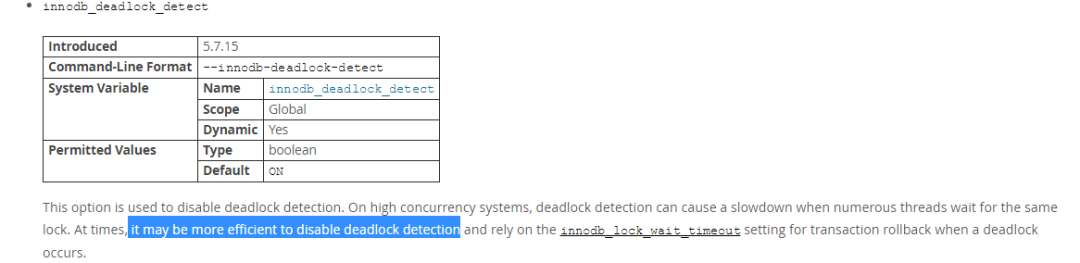 innodb_deadlock_detect=on,该选项使用了禁用MySQL的死锁检测功能的。在高并发系统上,当许多线程等待同一个锁时,死锁检测可能导致速度减慢。当发生死锁时,如果禁用了死锁检测则可能会更有效,这样可以依赖innodb_lock_wait_timeout的设置进行事务回滚。