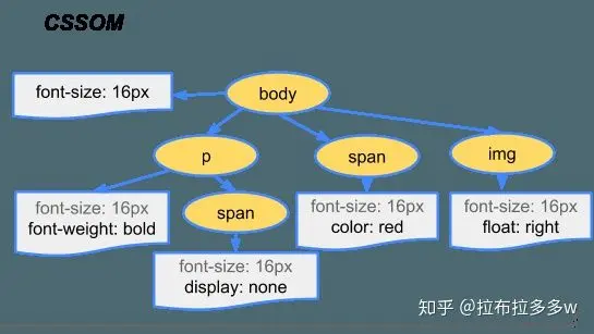 CSS会构建成CSS树(CSSOM)。CSS也是根据标签所具备的属性。在这里body是最大的。如果body所带的属性