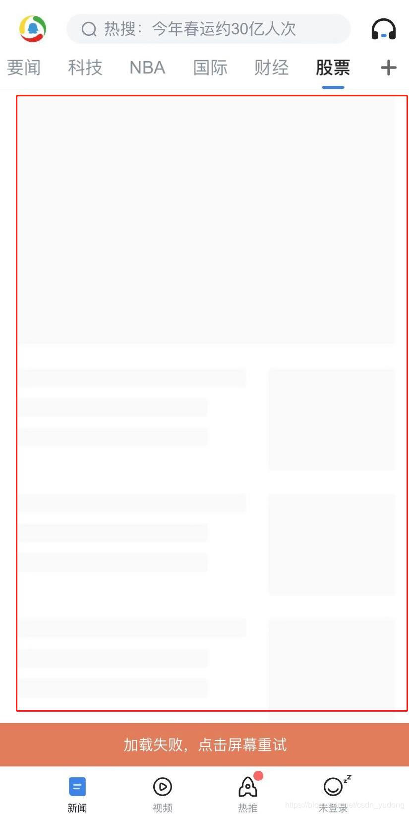 目前主流,常见的解决方案是使用骨架屏技术,包括很多原生的APP,在页面渲染时,也会使用骨架屏。(下图中,红圈中的部分,即为骨架屏在内容还没有出现之前的页面骨架填充,以免留白)