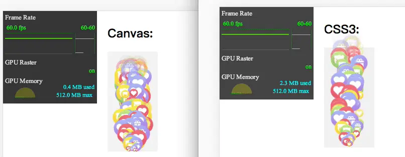 - CSS3 内存消耗比 Canvas 大,如果开启硬件加速,内存消耗更大一些。
