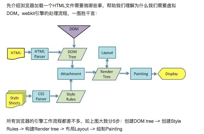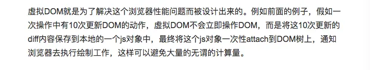 【传统DOM操作(eg:innerHtml)】:render html+重建所有DOM元素 【虚拟DOM】:render 虚拟DOM + diff算法+更新必要的DOM元素