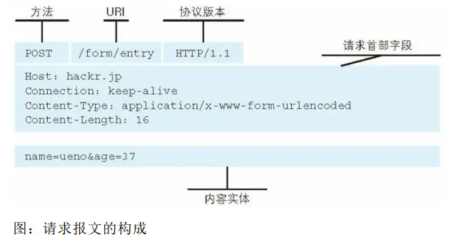 由请求行(请求方法、请求 URI、协议版本),首部字段和内容实体构成的。