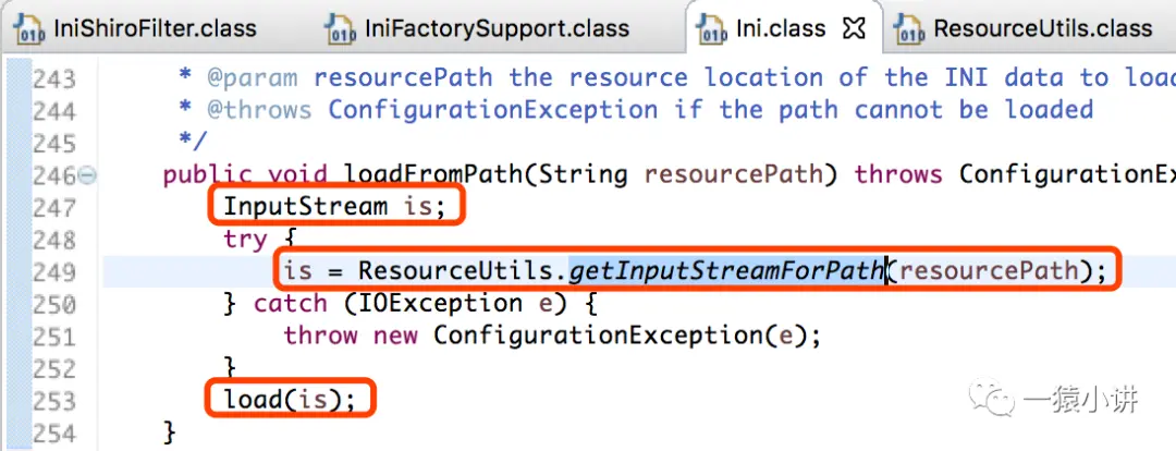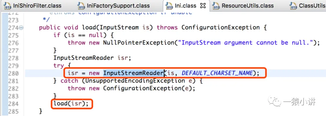 如上图源码所示,很显然会发现,具体读取 shiro.ini 配置的事情,就交给了 ResourceUtils 去办了(术业有专攻,分工明确,各司其职),不过和咱们能想到的土方法也差不多,就是往文件上插一根管子,然后调用 load 方法进行读取。