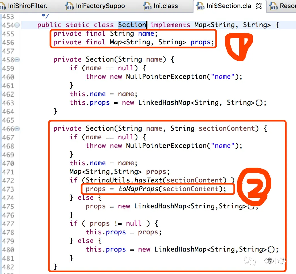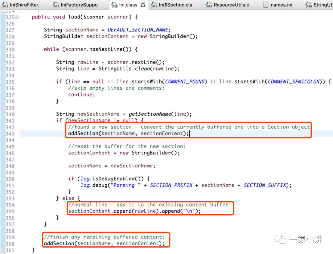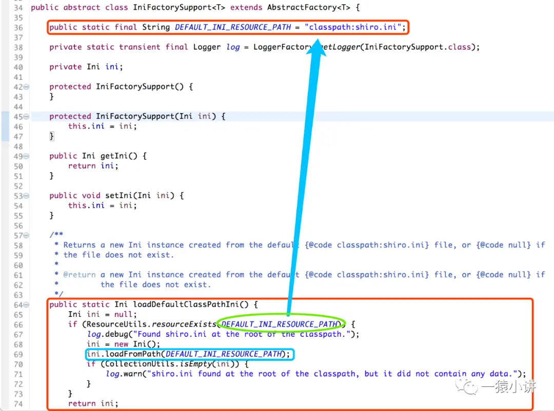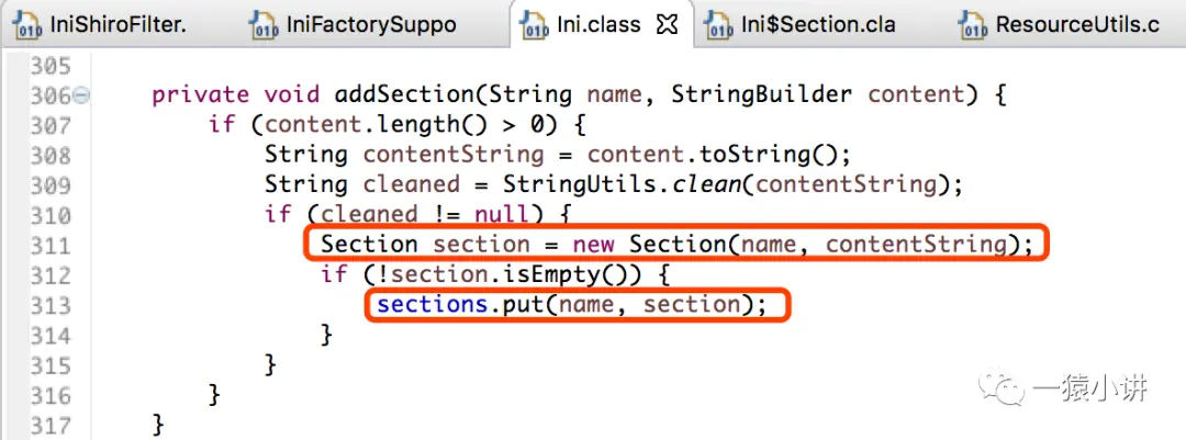 如上图源码所示,在加载 shiro.ini 配置文件前,首先会判断文件是否存在,存在则从类路径下进行加载,而且会发现 Shiro 把 ini 配置封装成了 Ini 对象(这不就是面向对象吗?Java 的核心思想:Every thing is object!)。