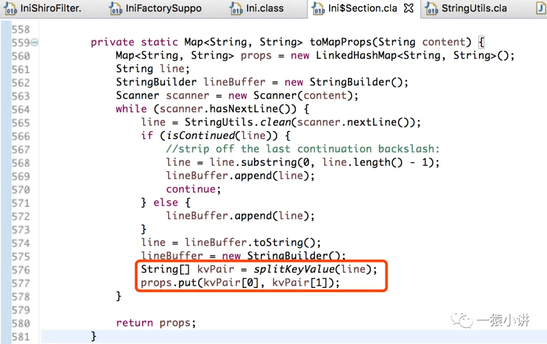 到这儿,如上面截图所示,看到了庐山真面目,终于见到了一行一行进行读取内容,并进行截取其中的 section(节),也就是 shiro.ini 中配置的 [main]、[urls] 等等,接着把每个 section 下面的内容直接拼接在一起形成字符串,而此时,并没有拆分键值对。