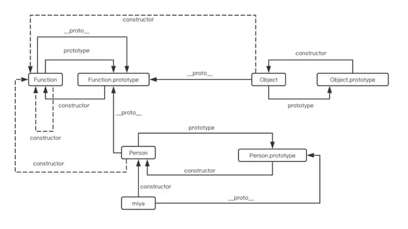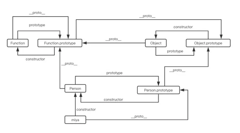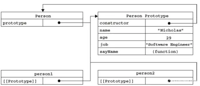 Person.prototype 指向了原型对象(Person Prototype), 而 Person.prototype.constructor 又指回了 Person, person1 和 person2 都包含一个内部属性[[Prototype]], 也就是所说的 __proto__, 该属性仅仅指向了 Person.prototype .