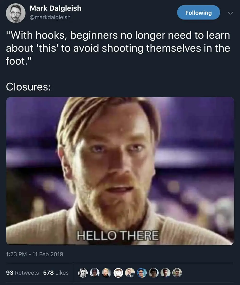 Hooks 的众多卖点之一就是:可以避免把 class 和高阶组件融合在一起。然而,感觉 Hooks 只是把一个问题转化成了另外一个问题。现在,我们不需担心上下文了,但是,需要担心闭包。就像 Mark Dalgleish 总结的一样: