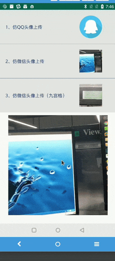 这篇博客实现的功能主要有仿微信,QQ 上传图像裁剪功能,包括拍照,从相册选取。裁剪框的样式有圆形,正方形,九宫格。