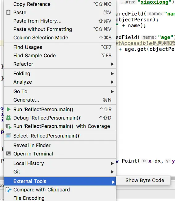 AndroidStudio自定义External Tools查看字节码 米饭_ 2020-04-14 372 阅读1分钟 自定义External Tools 在Preference中添加External Tools,保存就能用了; $JDKPath$\bin\javap -c -verbose $FileClass$ $OutputPath$ 使用 右键选择External Tools->Show Byte Code 可以看到你要的字节码文件内容了