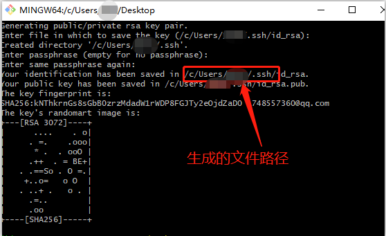 ssh-keygen -t rsa -C aaa@qq.com //这里最后面的邮箱是前面设置的Git的全局邮箱输入完命令后一直回车即可,当出现如下界面即表示设置成功,文件在当前电脑用户文件夹下