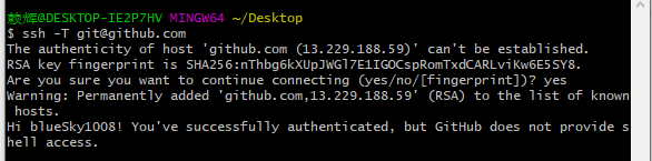 git bash中输入如下固定指令: ssh -T git@github.com如在本地ssh文件夹中多出现一个文件"known_hosts"和输入指令后出现的命令如下图即表示成功