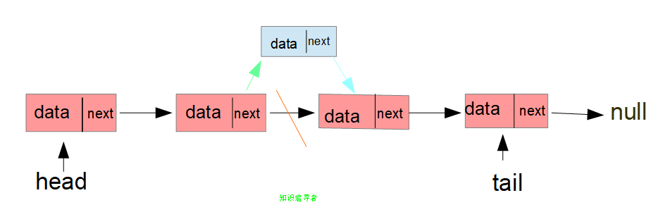 如下图所示,指定位置添加节点,需要将原来的节点指向新的节点,新节点指向原来节点的下一个节点;这边最重要的一点就是插入数据的位置是从第二个节点后面插入新节点(比如插入数据的索引是3,那么插入的位置应该是2的后面,找的位置也就是2);