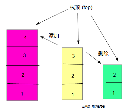 - 看下面一张经典得栈结构图,中间是原本得栈大小为3,栈顶的数值为3;如果往栈顶加入一个数值4,就会变为左边的图,此时栈顶为4,栈大小为4;如果中间栈的删除一个元素,就会变为右边的图,此时栈顶值为2,栈大小为2;