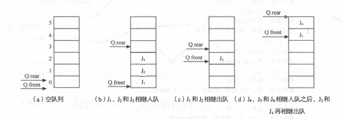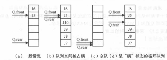 - d. 当J7,J8,J9入队后,(Q.rear +1)%MAXQSIZE 的值等于Q.front,此时认为队满。