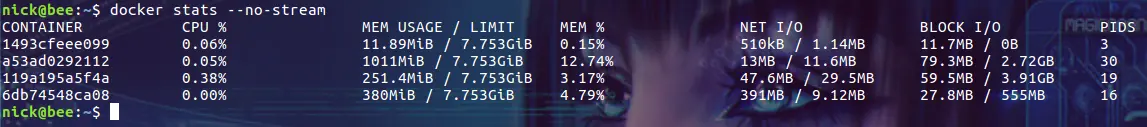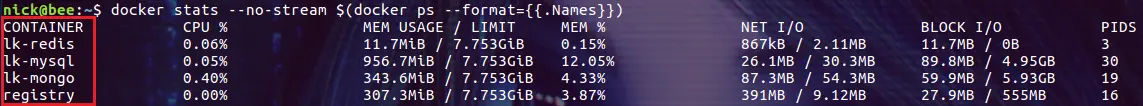 如果不想持续的监控容器使用资源的情况,可以通过 --no-stream 选项只输出当前的状态: