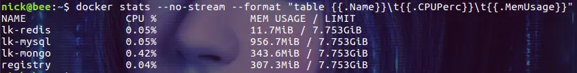 $ docker stats --format "table {{.Name}}\t{{.CPUPerc}}\t{{.MemUsage}}"