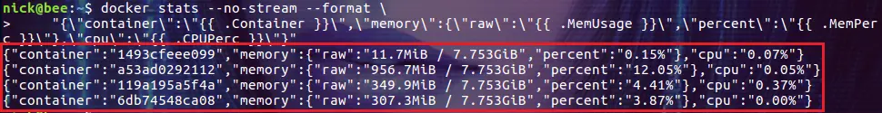 "{\"container\":\"{{ .Container }}\",\"memory\":{\"raw\":\"{{ .MemUsage }}\",\"percent\":\"{{ .MemPerc }}\"},\"cpu\":\"{{ .CPUPerc }}\"}"