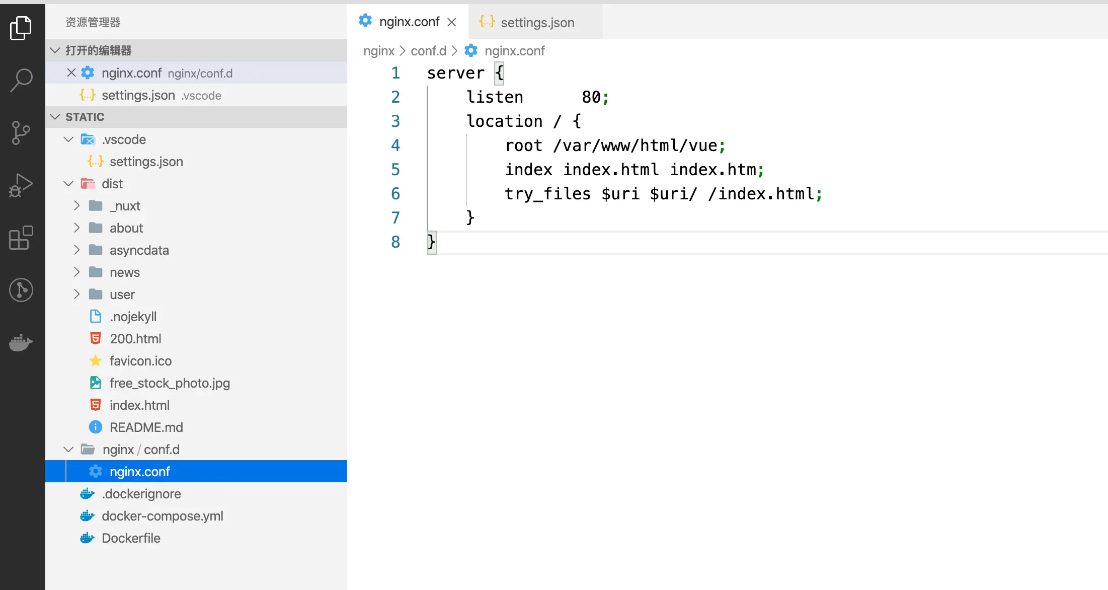 第四步:创建好一下文件,并将dist文件一起放入服务器上