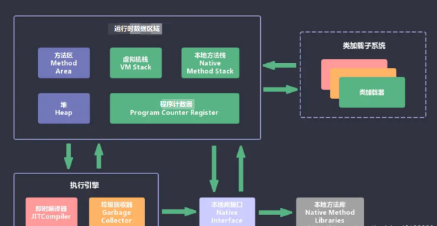 JVM包含两个子系统和两个组件: 两个子系统为Class loader(类装载)、Execution engine(执行引擎); 两个组件为Runtime data area(运行时数据区)、Native Interface(本地接口)。