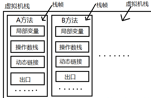 - 解释:虚拟机栈中是有单位的,单位就是栈帧,一个方法一个栈帧。一个栈帧中他又要存储,局部变量,操作数栈,动态链接,出口等。