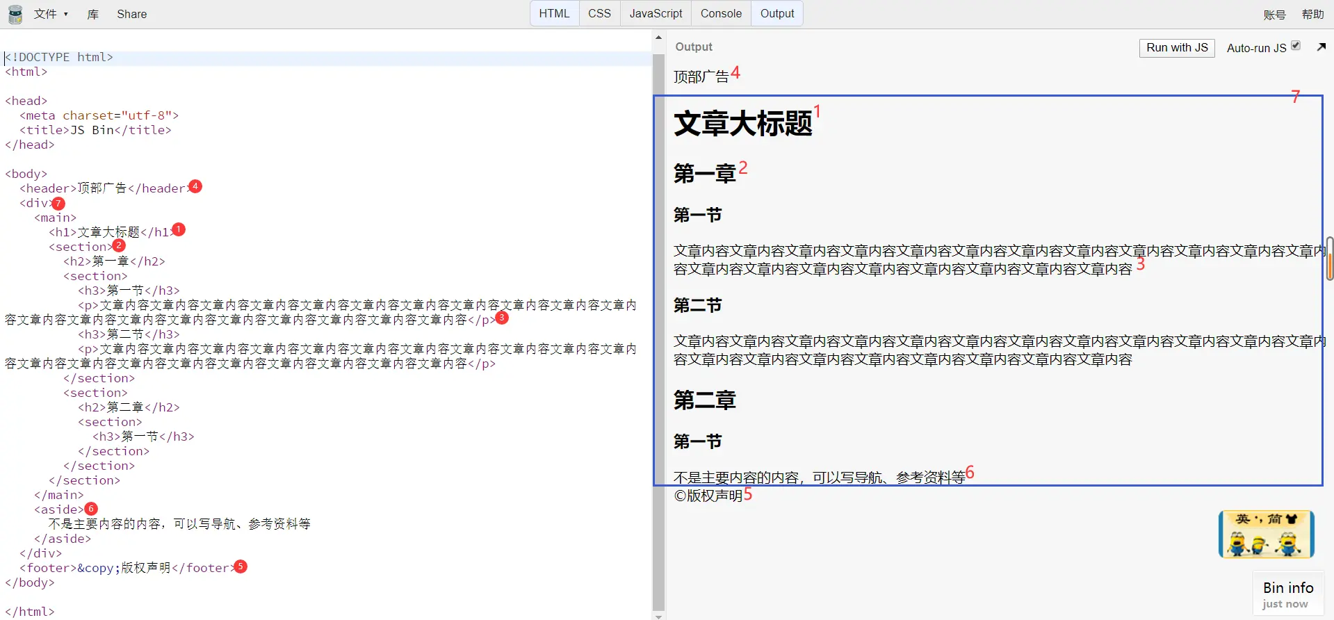 <h1>~<h6>标题<section>章节<article>文章<p>文章段落(paragraph)<header>头部<footer>脚部<main>主要内容<aside>旁支内容<div>一个区块(division)