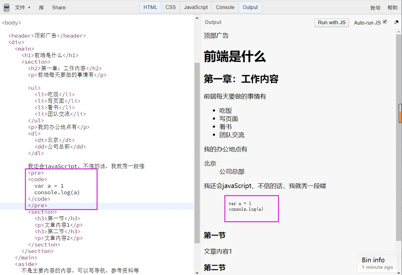 <code>表示标签内容就是代码 如果想表示多行代码,code标签必须放在pre内部<pre>标签+<code>标签的搭配使用效果图: -