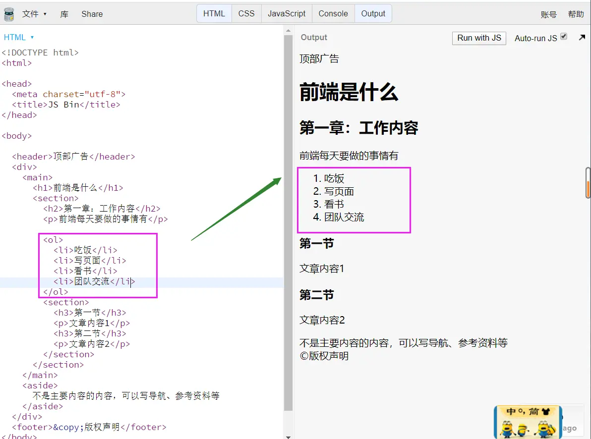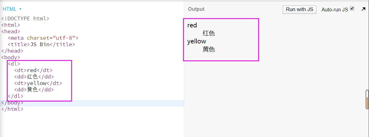 <dl>,<dt>,<dd><dl>表示一术语的列表(description list),术语名(description term)由<dt>标签定义,术语解释(description detail)由<dd>标签定义效果图展示: