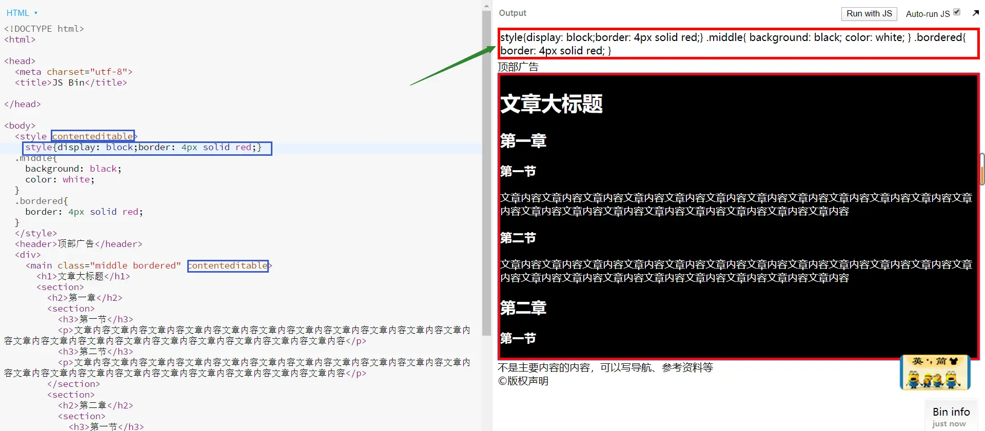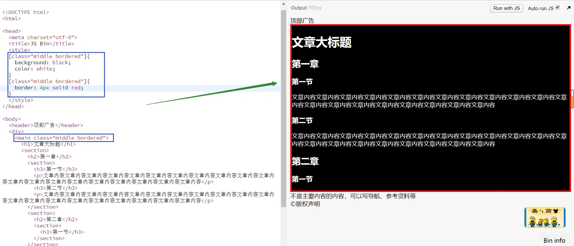 注:上面的效果图针对元素具有多个class的情况,代码写起来会比较繁琐,所以可以换用CSS简单的语法,效果同上图:.middle{ blackground: black; color: white; } .bordered{ border: 4px solid red; } -