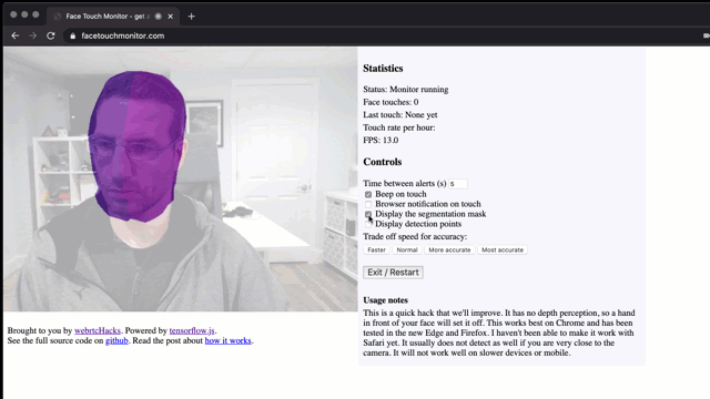 donottouchyourface.com在几周前发布,也收到了一些好评。初次使用时,你需要使其熟悉你的面部轮廓,大约5秒钟就可以了。然后你需要触摸脸部,多次重复此过程。该程序会播放一个音频文件并发送浏览器通知。如果之后你的位置与识别过程中的位置相同,那么程序会成功运行。但是如果你在识别过程中改变位置,或没有提供足够的可识别项,程序运行可能会很不稳定。示例如下: