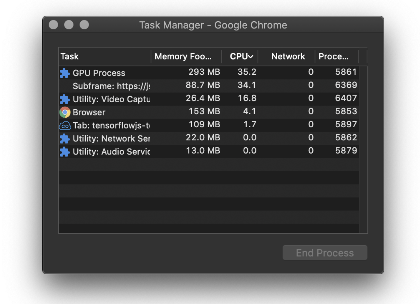 TensorFlow.js实际上有一个Web Assembly库,其运行速度明显更快。我希望这可以帮助解决CPU消耗问题,但是我遇到了两个问题: