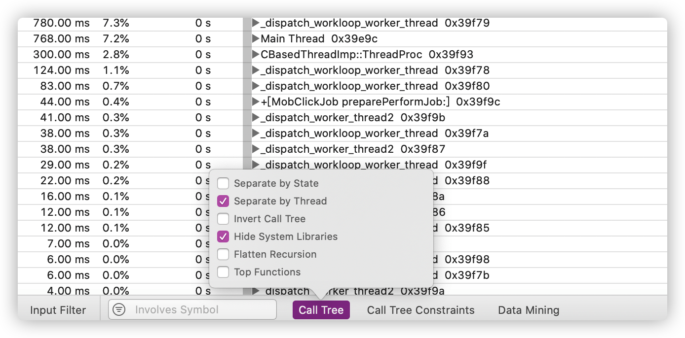Xcode自带的工具,原理是定时抓取线程的堆栈信息,通过统计比较时间间隔之间的堆栈状态,计算一段时间内各个方法的近似耗时。精确度取决于设置的定时间隔。通过 Xcode → Open Developer Tool → Instruments → Time Profiler 打开工具,注意,需将工程中 Debug Information Format 的 Debug 值改为 DWARF with dSYM File,否则只能看到一堆线程无法定位到函数。