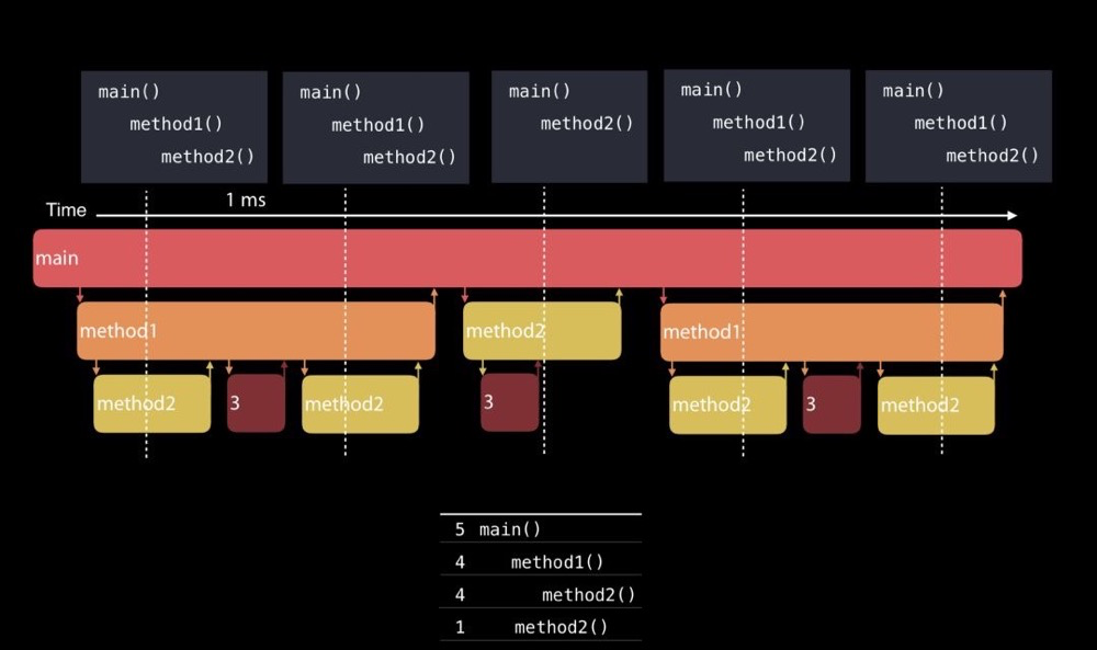 正常Time Profiler是每1ms采样一次, 默认只采集所有在运行线程的调用栈,最后以统计学的方式汇总。所以会无法统计到耗时过短的函数和休眠的线程,比如下图中的5次采样中,method3都没有采样到,所以最后聚合到的栈里就看不到method3。